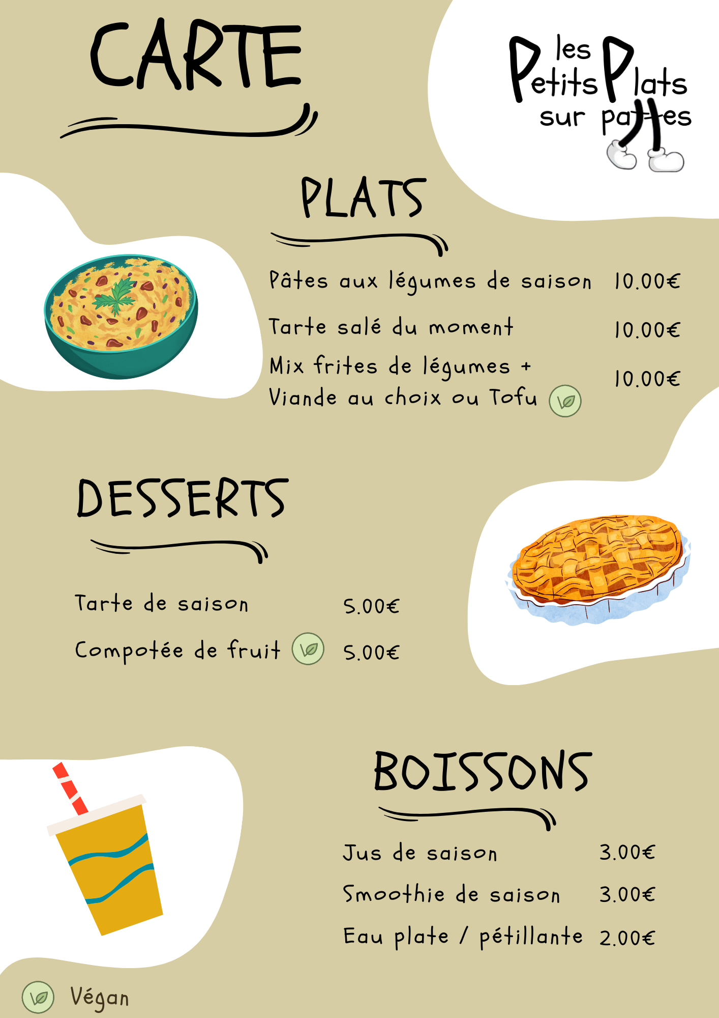 Découvrez Les Petits Plats sur Pattes, le food truck qui vous apporte des plats faits maison, savoureux et préparés avec amour, là où vous en avez envie ! Que ce soit pour un déjeuner rapide, un événement spécial ou une pause gourmande, nous nous déplaçons pour vous régaler.
